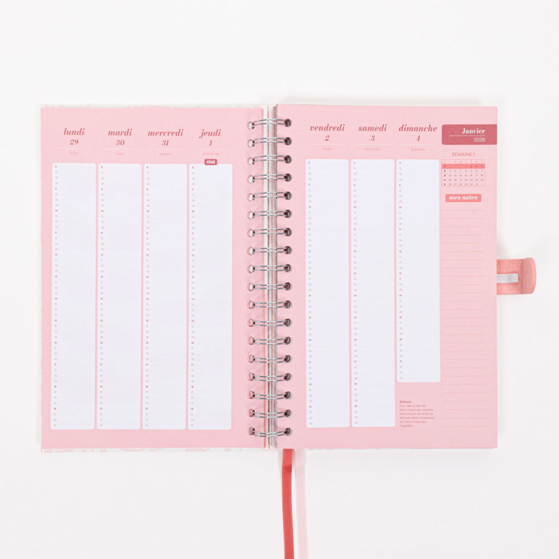 Format : Agenda annuel 2026 et son crayon rose, mise en page claire et fonctionnelle