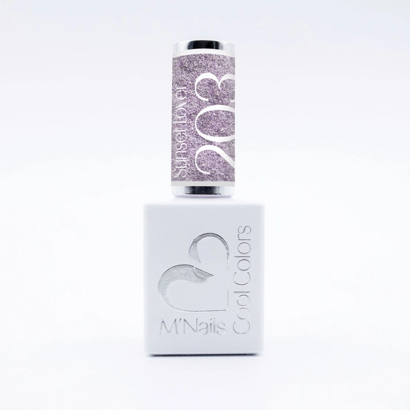 La teinte Sunset Lover dévoile un violet délicat ponctué de paillettes argentées froides, qui accrochent joliment la lumière. Une couleur à la fois fraîche et brillante, parfaite pour créer des manucures printanières ou estivales.