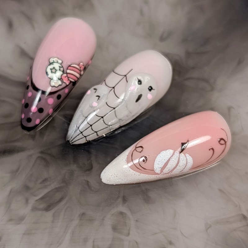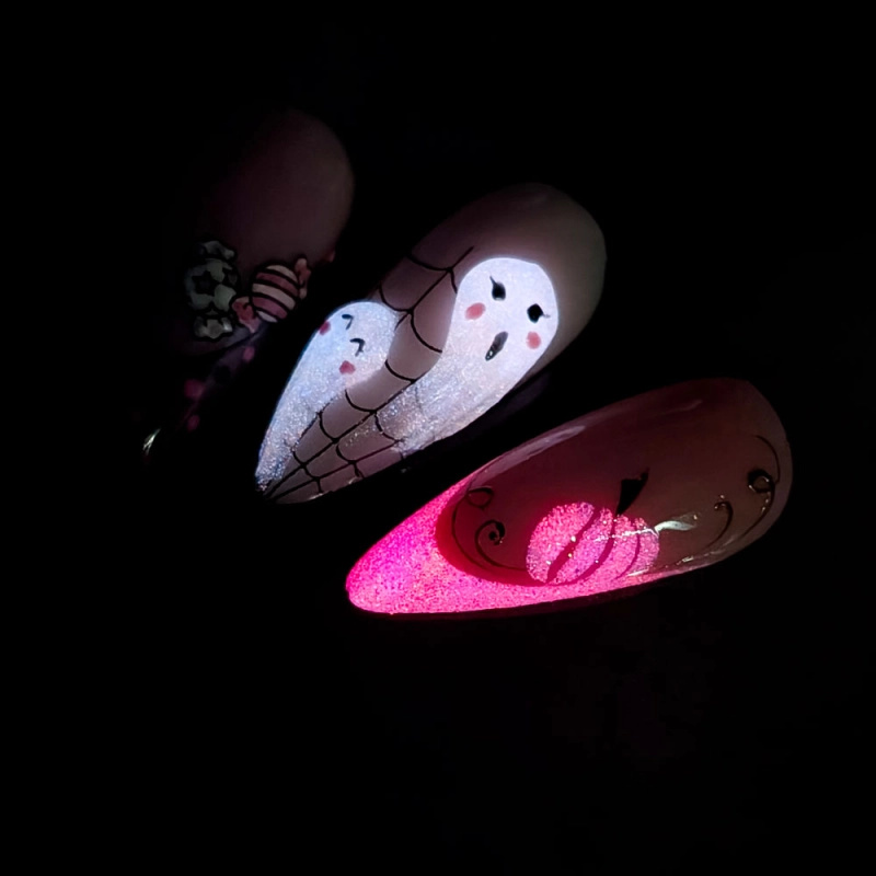 Les stickers Halloween s’appliquent facilement sur vernis ou gel. Ils conviennent à toutes les longueurs d’ongles et tous les styles de nail art. L’Acrygel Glow Pasta permet de construire, modeler ou décorer. Sa lumière phosphorescente apporte un effet surprenant dans l’obscurité.