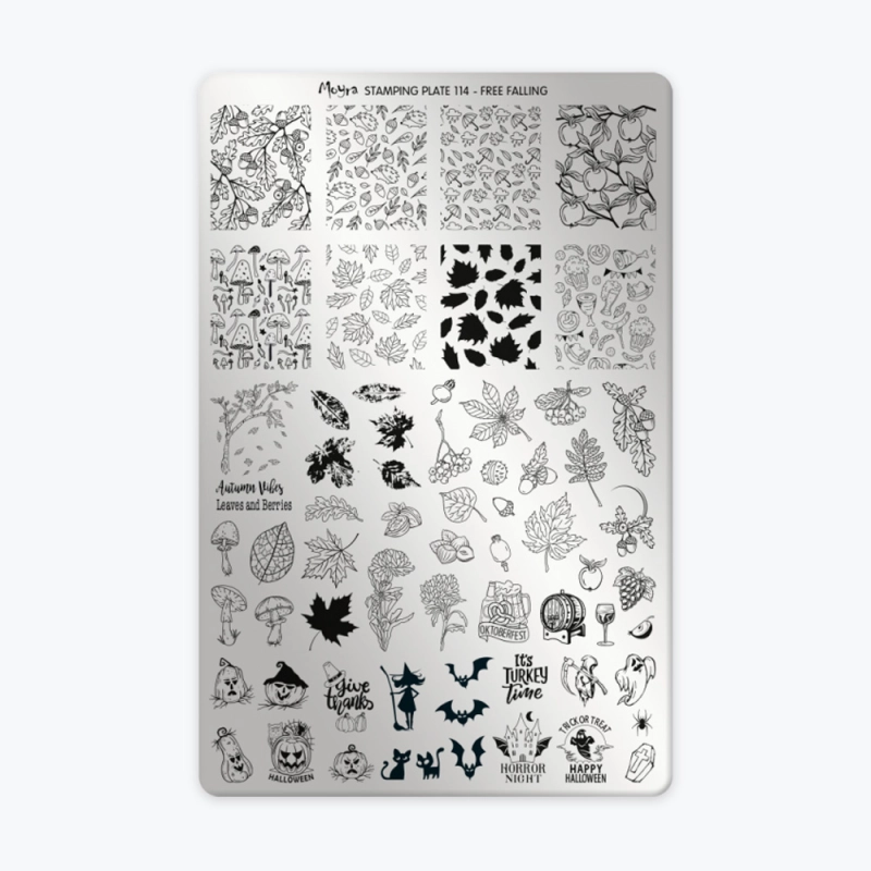La Plaque 114 – Free Falling de Moyra est idéale pour réaliser des nail arts d’automne.