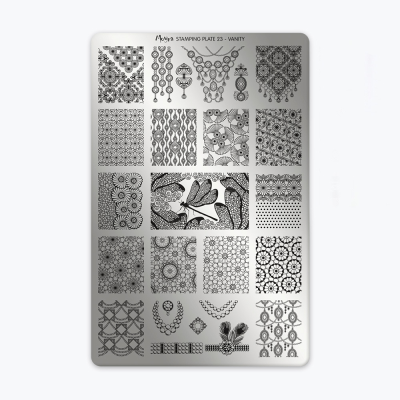La Plaque 23 – Vanity de la marque Moyra est idéale pour réaliser des manucures inspirées du luxe. Ses motifs détaillés, comprenant des fleurs et des bijoux scintillants, permettent de créer des nail arts sophistiqués et glamour, parfaits pour des événements prestigieux, des soirées ou des mariages.