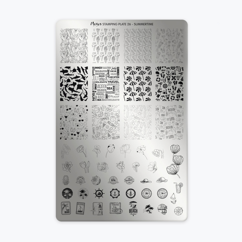 La Plaque 26 – Summertime de Moyra est idéale pour créer des manucures estivales aux décors ensoleillés et joyeux.