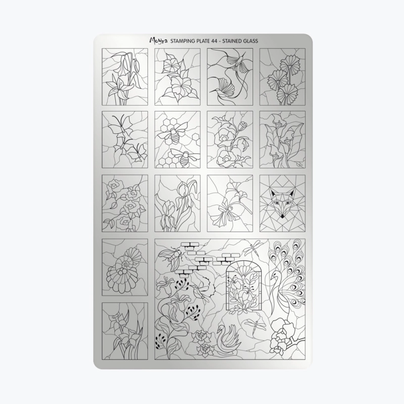 La Plaque 44 – Stained Glass de Moyra est idéale pour réaliser des nail arts sophistiqués inspirés des vitraux et de la peinture sur verre.