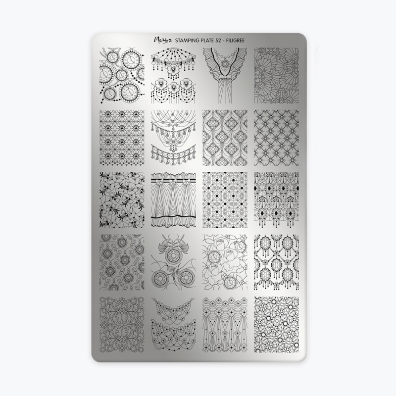 La Plaque 52 – Filigree de Moyra est idéale pour réaliser des nail arts élégants et décoratifs inspirés du filigrane et des bijoux sophistiqués.