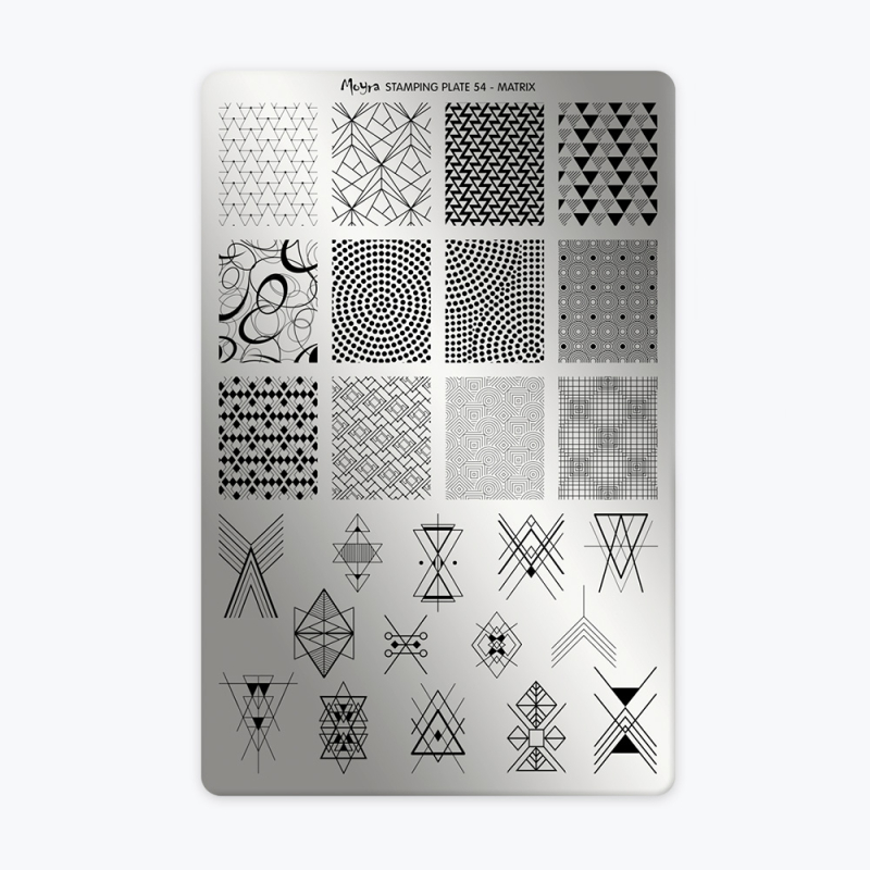 La Plaque 54 – Matrix de Moyra est idéale pour des nail arts graphiques, modernes et dynamiques.