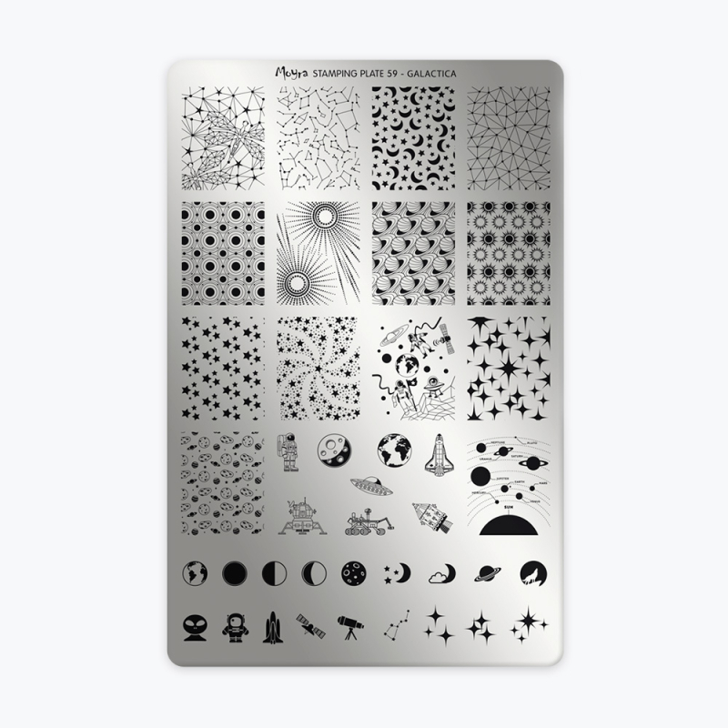 La Plaque 59 – Galactica de Moyra est idéale pour réaliser des manucures inspirées du cosmos et de l’univers galactique.