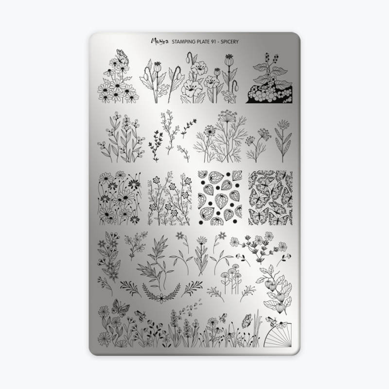 La Plaque 91 – Spicery de Moyra est idéale pour créer des nail art floraux et romantiques. Avec ses motifs de fleurs fines et papillons, elle permet de composer des manucures tendances en toute simplicité.