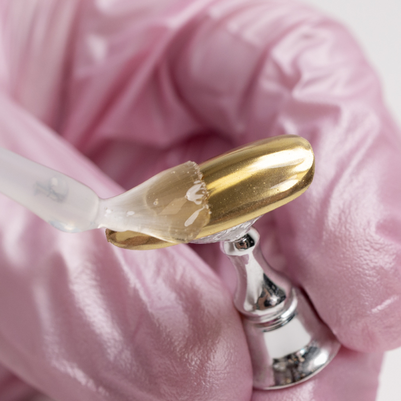 Ce gel est conçu pour fixer les pigments chrome et les décorations délicates sans les altérer. Il crée une base adaptée pour travailler les effets chrome tout en assurant une tenue dans le temps.